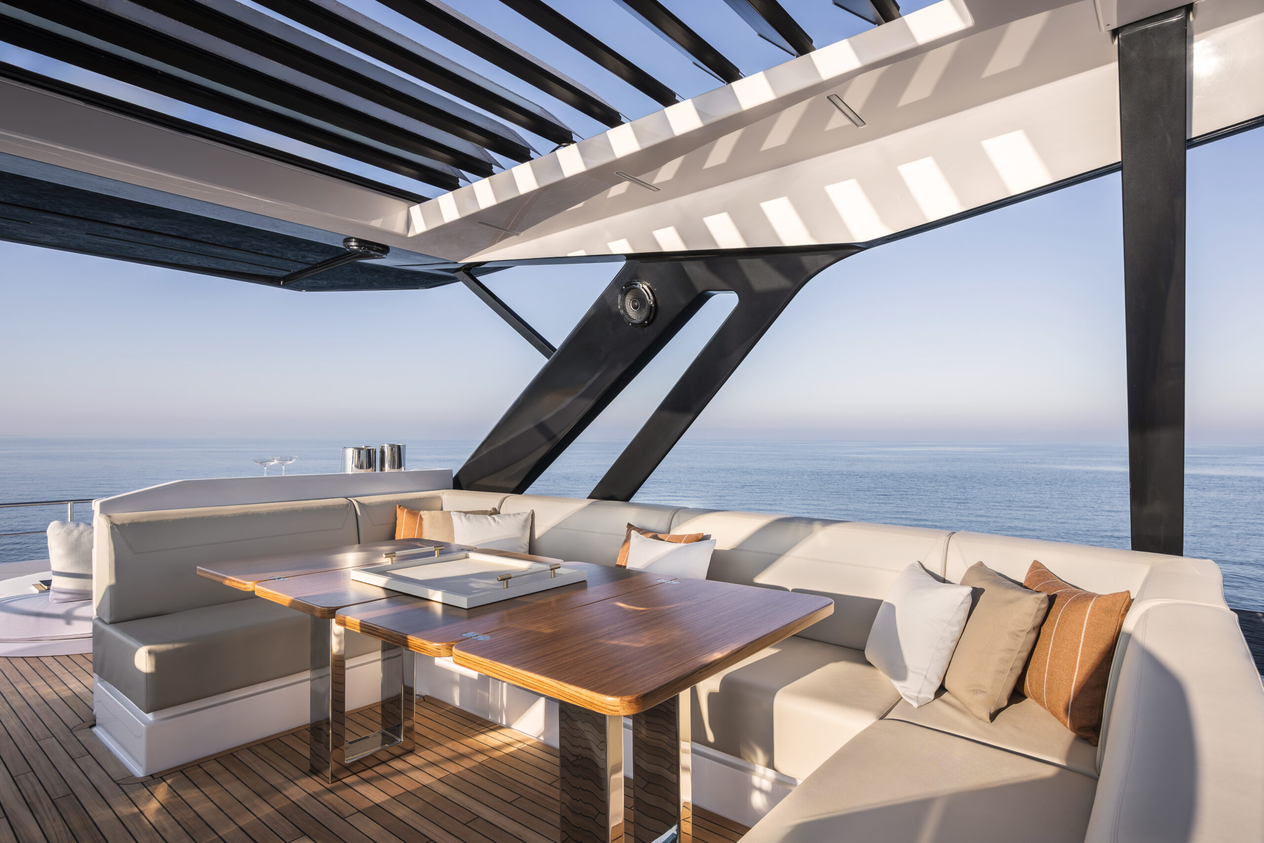 在飞桥甲板的船艏区域,一张大型的日光浴垫横贯整个甲板宽度,船艉露台则可搭配非固定式的家具,营造出灵活多功能的温馨空间。