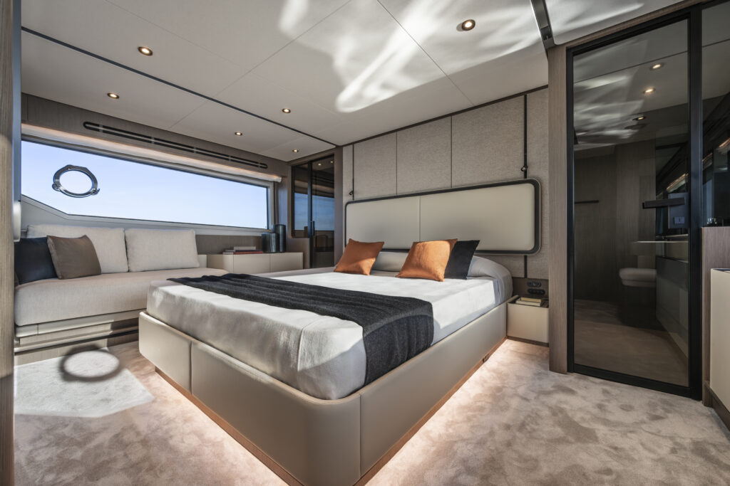 船东套房的左舷处设有设计简约的梳妆台,对面是一张舒适的沙发紧邻步入式衣帽间。衣帽间位于床后方墙体的后侧,通过移门与其他区域分割,紧靠独立卫浴。这一空间布局与机舱形成了有效分隔,确保了更好的隔音。可以选配带烟熏色镜面玻璃的电视柜。显著增加的储物空间,确保了功能性与优雅之间的完美平衡。