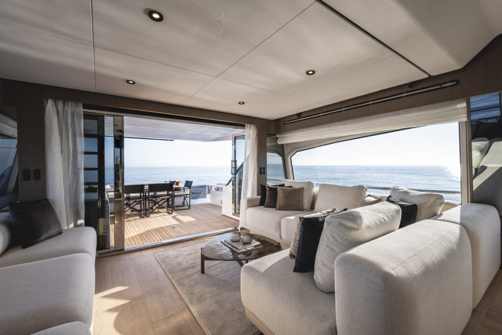 由三扇式玻璃门进入沙龙:左侧有平开式玻璃门,在游艇航行时也可开启,右侧为两扇玻璃移门。这一设计令沙龙与艉阱连为一体,在游艇的室内外实现完美衔接。